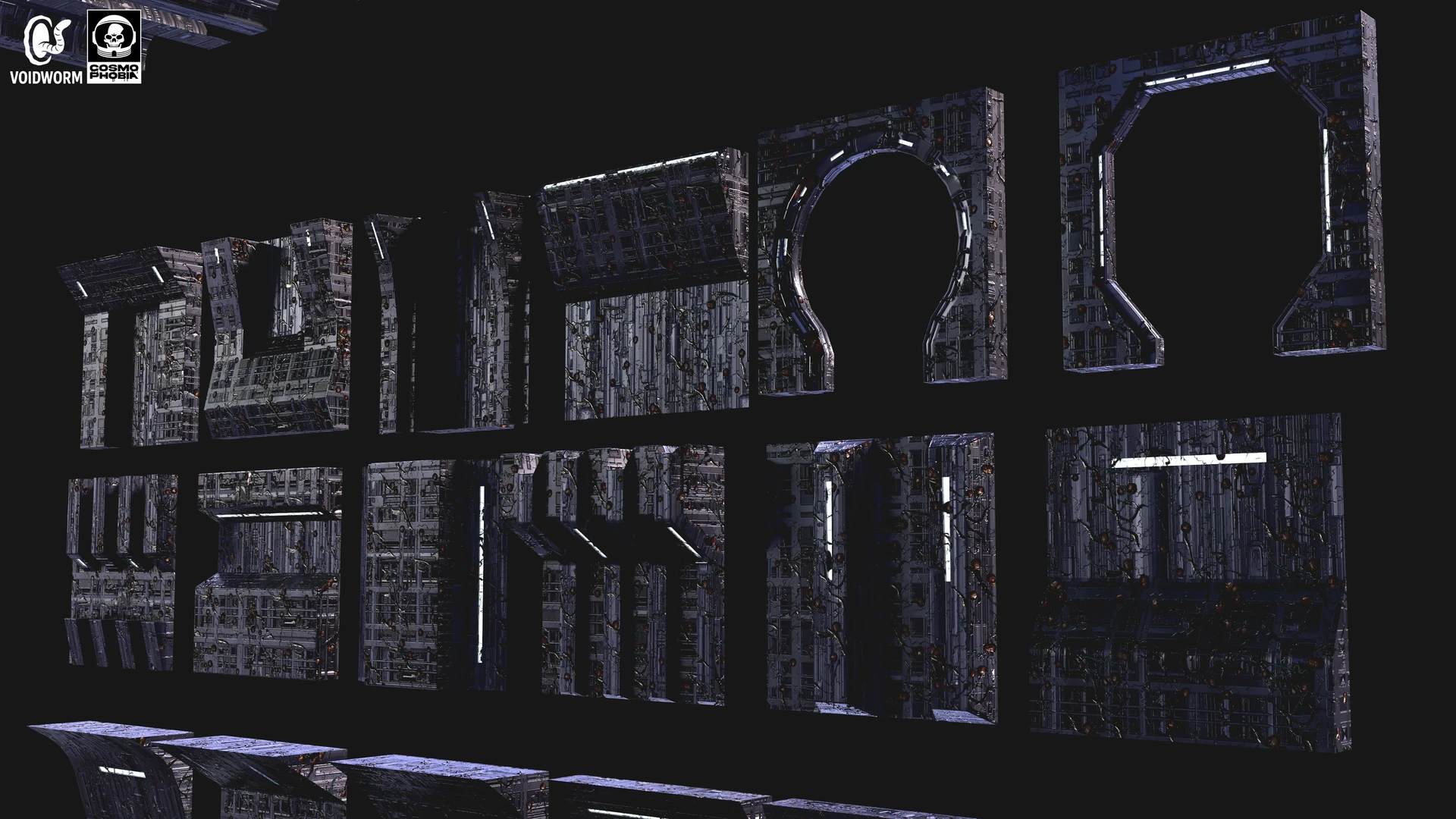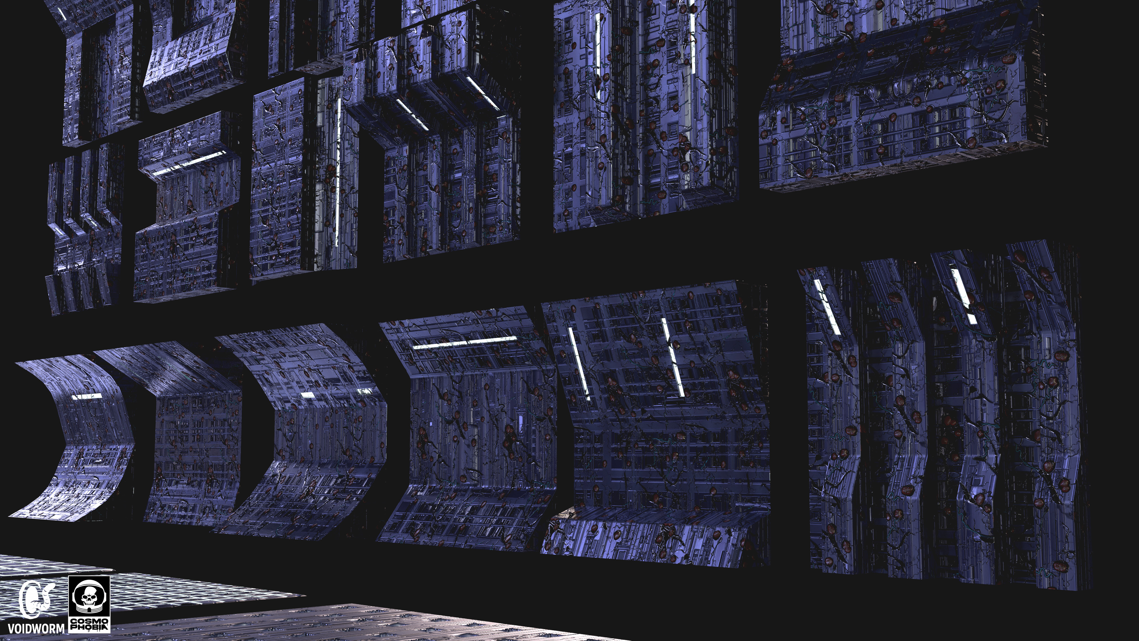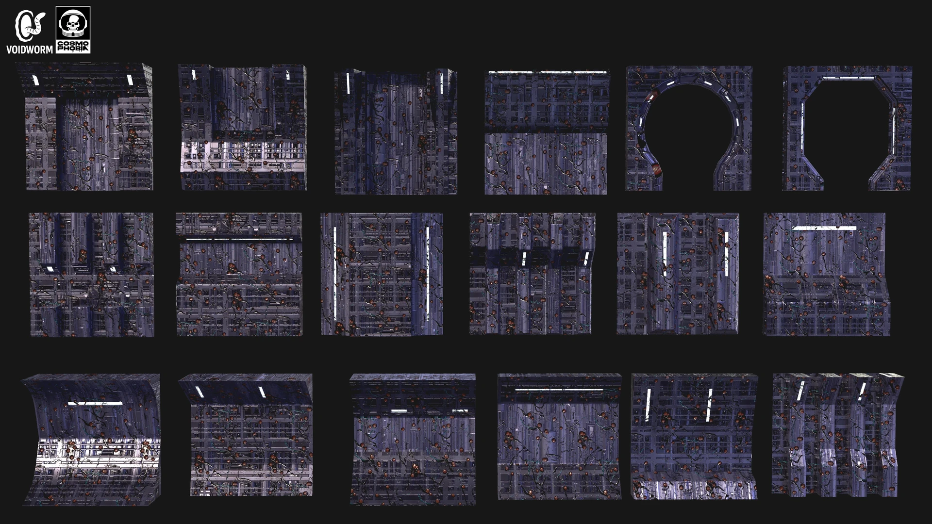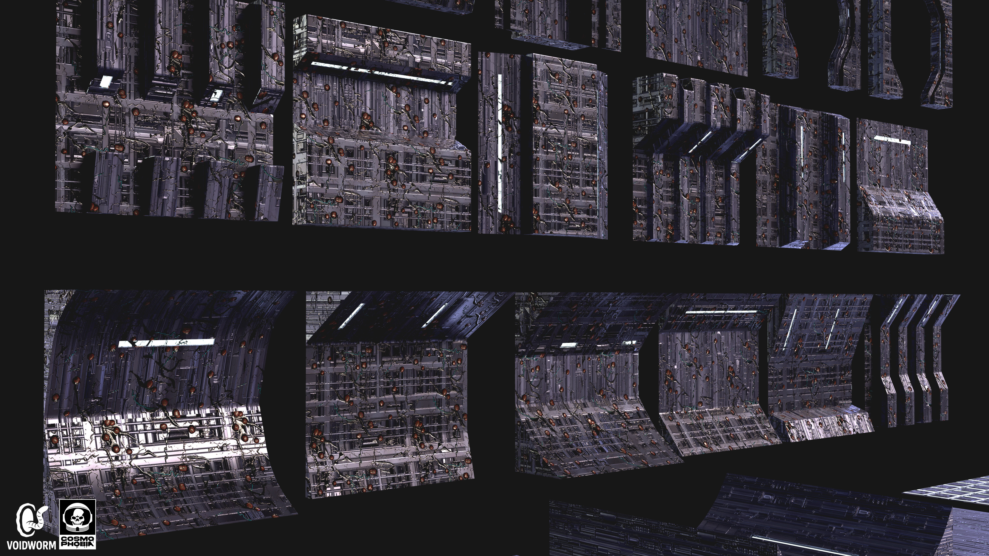 The many modular assets ranging from floors, ceilings, and walls that I created for the procedural environments for Voidworm LLC’s upcoming sci-fi horror indie game, Cosmphobia. These were interesting to conceptualize and 3d model since many of them can be combined with each other to create completely new assets due to their simplicity. It was also a joy seeing the two procedural materials I created prior, spaceship machinery & alien infestation, be implemented as the materials for these assets during the texturing stage. Each modular asset features three different stages of the alien infestation material I created for further variations for the environments in game. The combination of metal and organic matter will always be a pleasure to work with for me. I am very thankful for this wonderful creative opportunity to bring the studio owner’s vision to life.